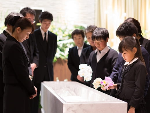 お式の後、式場にて故人様へお花や思い出のお品を入れていただき、最後のお別れをしていただきます。