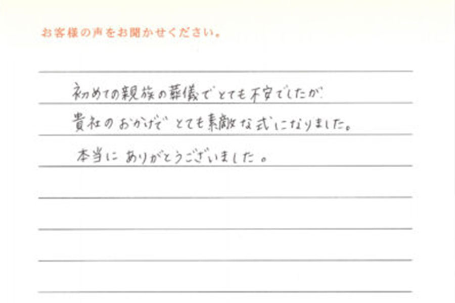 初めての親族の葬儀でとても不安でしたが、貴社のおかげでとても素敵な式になりました。